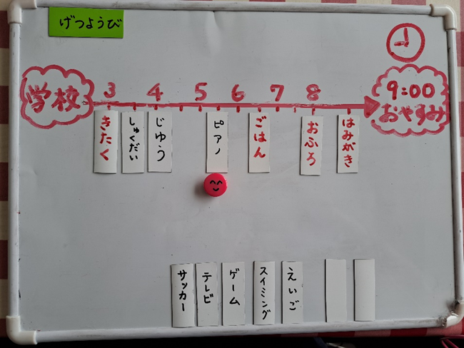 一日の流れを見えるようにする事、また、曜日によってスケジュールが変わる場合は、磁石などで動かせる様にすると、自分で考えスケジュールを組み立て、行動できる子になります。